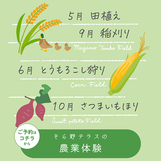 広大な田園に張り出すテラスは、「そら」と「野」を感じる場所。その土地でその時期に生み出された、季節の味と出会える農園です。