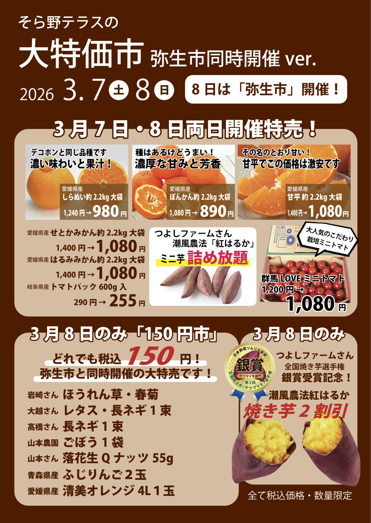 8日のみの限定開催は「150円市👛」や「銀賞受賞焼き芋🍠2割引」!