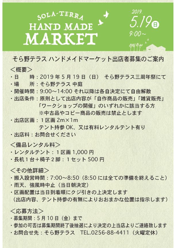 5月19日「三周年祭」「ハンドメイドマーケット」開催です