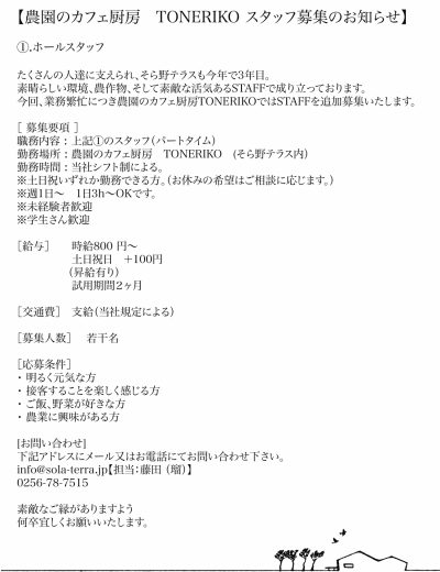 【農園のカフェ厨房 TONERIKO スタッフ募集のお知らせ】
