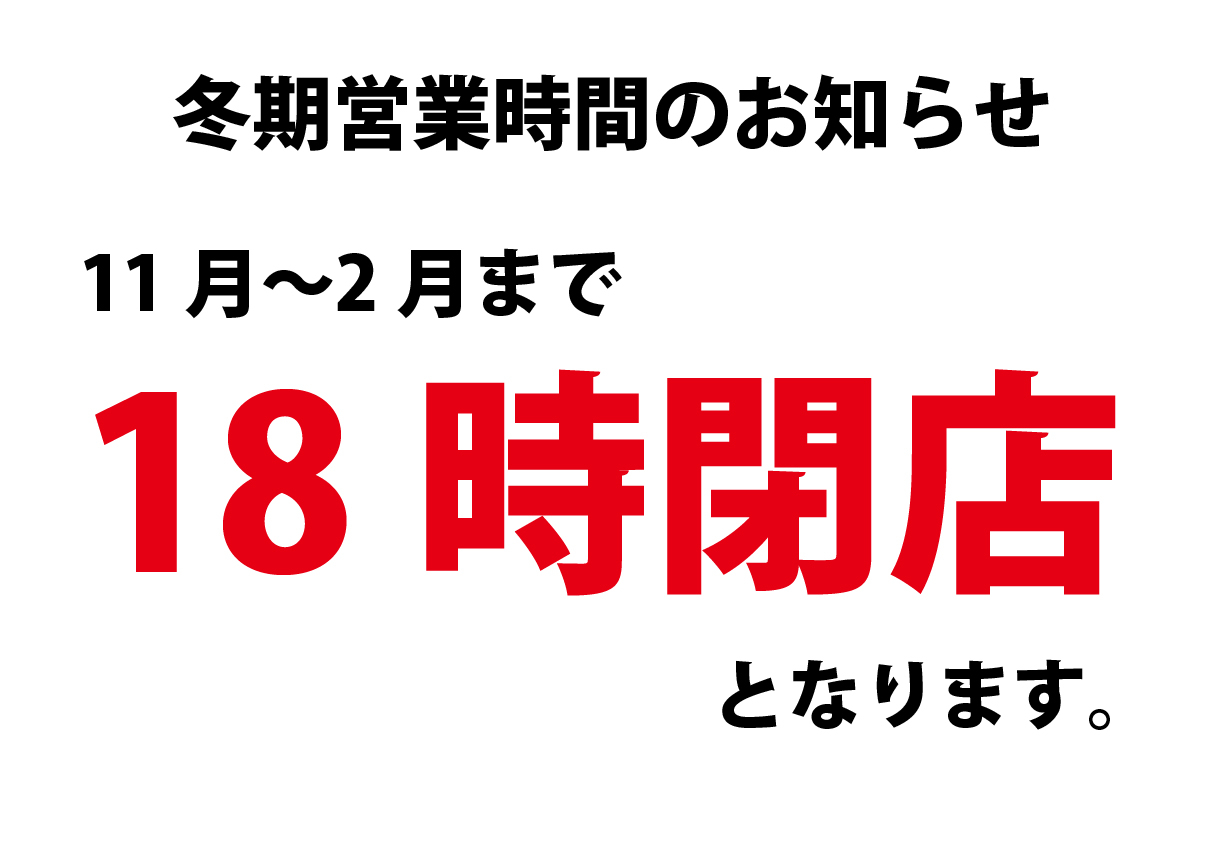 2025.11.01, そらの通信 冬期営業時間のお知らせ いつもそら野テラスをご利用いただきありがとうございます。 冬期営業時間のお知らせです。 11月1日〜2月末日まで、閉店時間が1時間早まり、18時閉店となります。 ご来店の際は閉店時間にご注意ください。 皆様のお越しをお待ちしております。 « 過去の投稿 新しい投稿 »