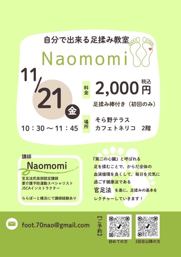 2025.11.01, イベント情報 【11月開催】足揉み教室のお知らせ 2025年11月21日(金)、そら野テラス2階で「自分で出来る足揉み教室」開催です👣 『第二の心臓』と呼ばれる足を揉むことでからだ全体の血液循環を良くして不調の改善を目指しましょう! 初めて参加の方には足揉み棒付き! ご自宅でも実践できるのは嬉しいですね☺️ ぜひぜひご参加くださいね〜! « 過去の投稿