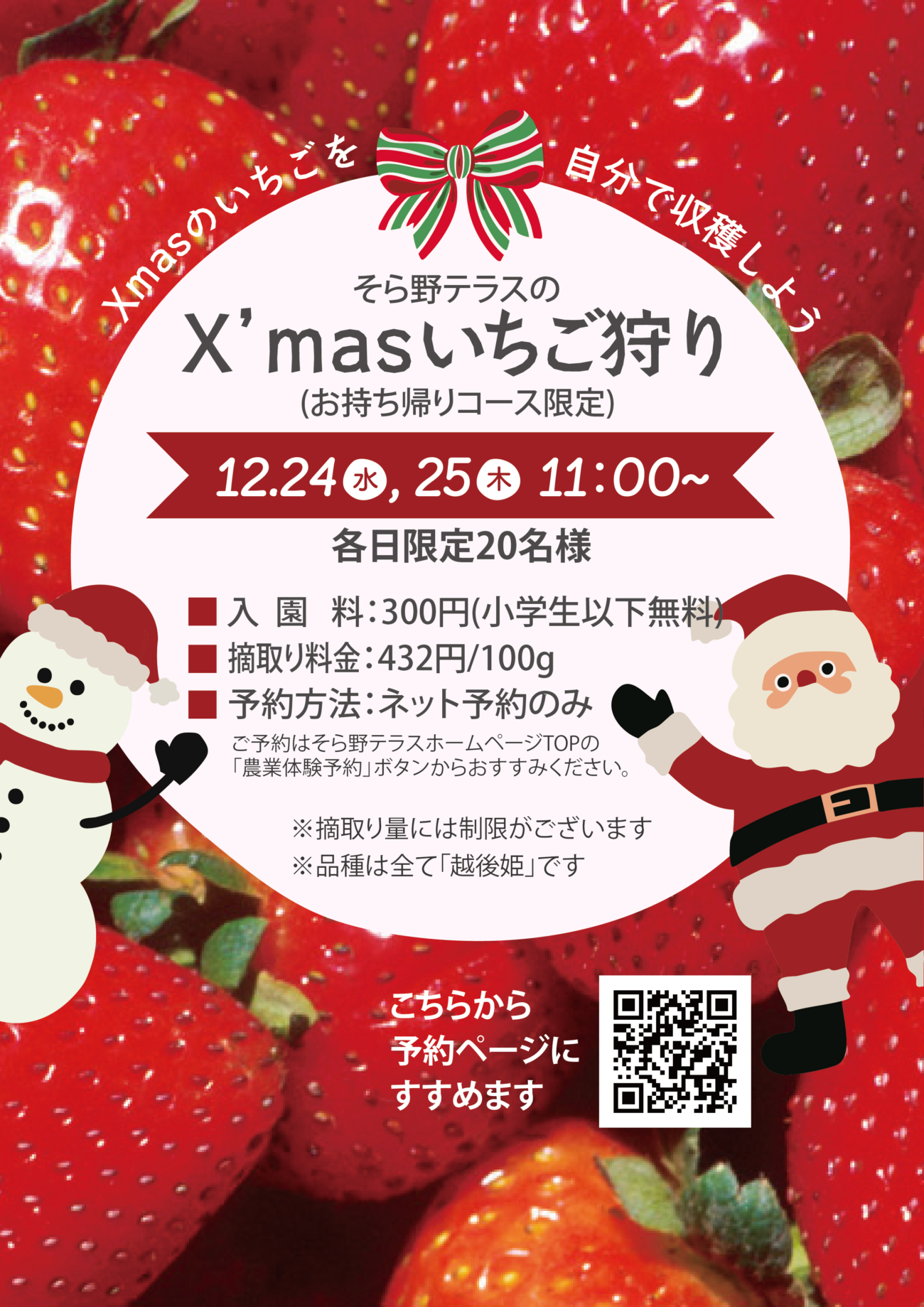 2025年12月24日(水)、25日(木)の2日間、そら野テラスの『Xmasいちご狩り』開催です🍓