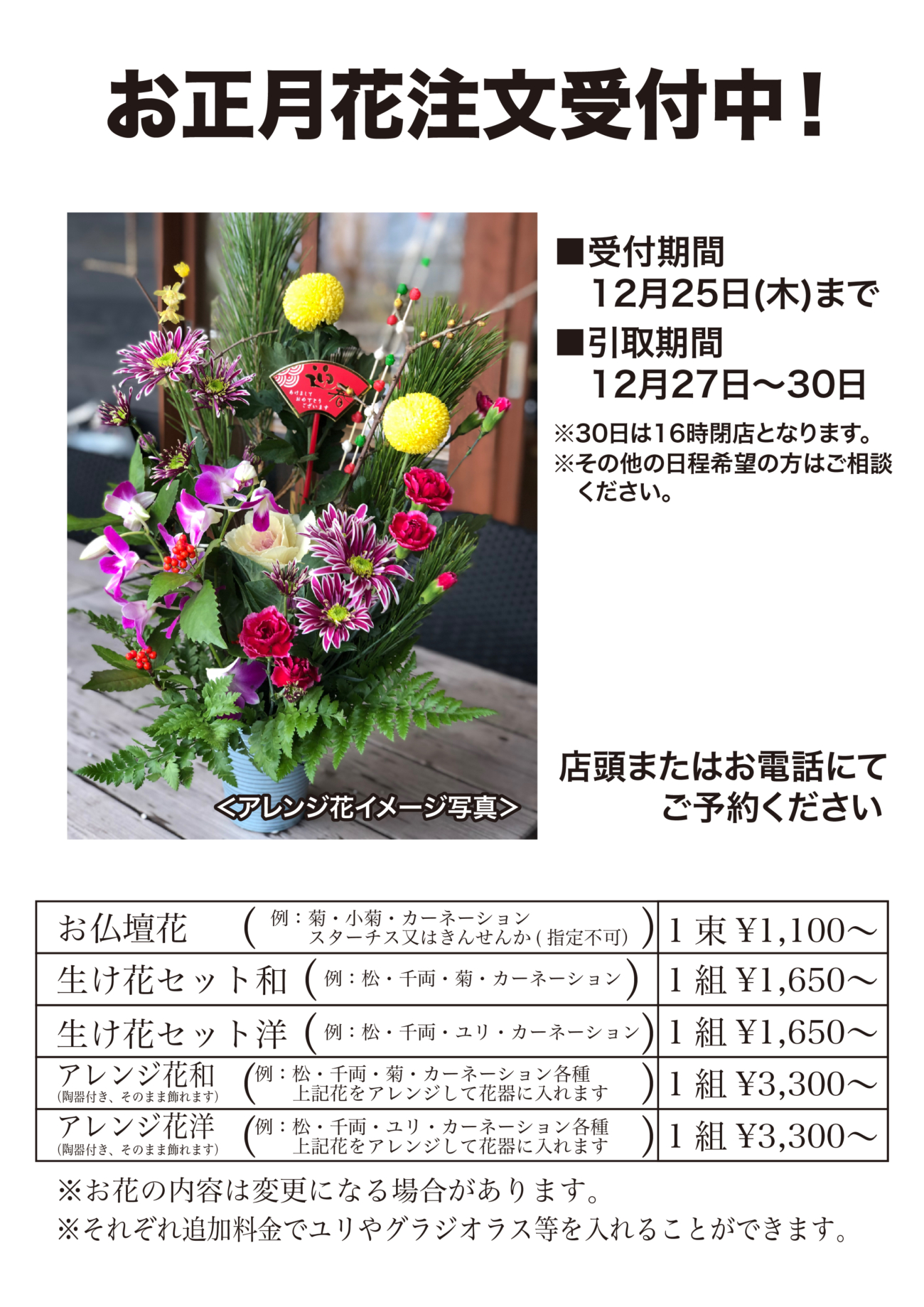 2025.12.14, イベント情報 お正月用お花の予約受付開始しました🎍 お待たせしました! お正月花の予約受付を開始しました。 ご予約受付は12月25日までとなります。 華やかなお花で縁起の良い新年を迎えましょう😊 ご予約お待ちしております。 « 過去の投稿