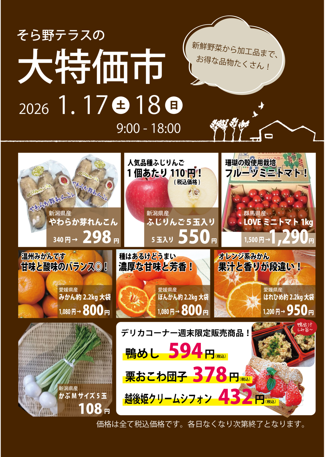 2026.01.16, イベント情報 1月17日・18日『週末特売』! 今週末の特売のお知らせです! 1月17日(土)、18日(日)の両日開催。 マルシェ新鮮野菜が大特売🎉 旬のやわらか芽れんこん、かぶ、フルーツミニトマトの他、大人気みかん大袋も超お買い得価格です👍 デリカコーナーでは週末限定メニューの販売も🦆 ぜひぜひお越しくださいませ〜!!!☺️ « 過去の投稿