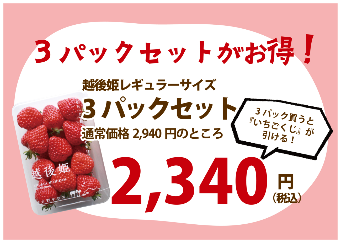 2026.01.24, イベント情報 1月25日越後姫大特価 1月25日越後姫3パックまとめ買いセール開催! 3パックお買い上げでそら野のいちご関連商品が当たる「いちごくじ」が引けます🍓 寒い時期ですが、美粒で甘みがのった美味しいそら野の越後姫ぜひお買い求めください! 皆様のお越しをお待ちしております😆 « 過去の投稿