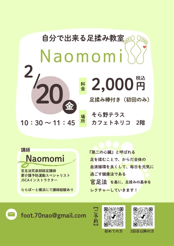 2026.01.26, イベント情報 【2月開催】自分で出来る足揉み教室 2026年2月20日(金)、そら野テラス2階にて「自分で出来る足揉み教室」開催です! 寒くて体が縮こまり、手足の冷えや凝りを感じませんか? 足揉み棒を使ったセルフケアで体の不調を手軽に改善しましょう! 初参加の方でも丁寧に指導しますので安心してご参加ください☺️ 皆さまのご参加お待ちしております。 « 過去の投稿