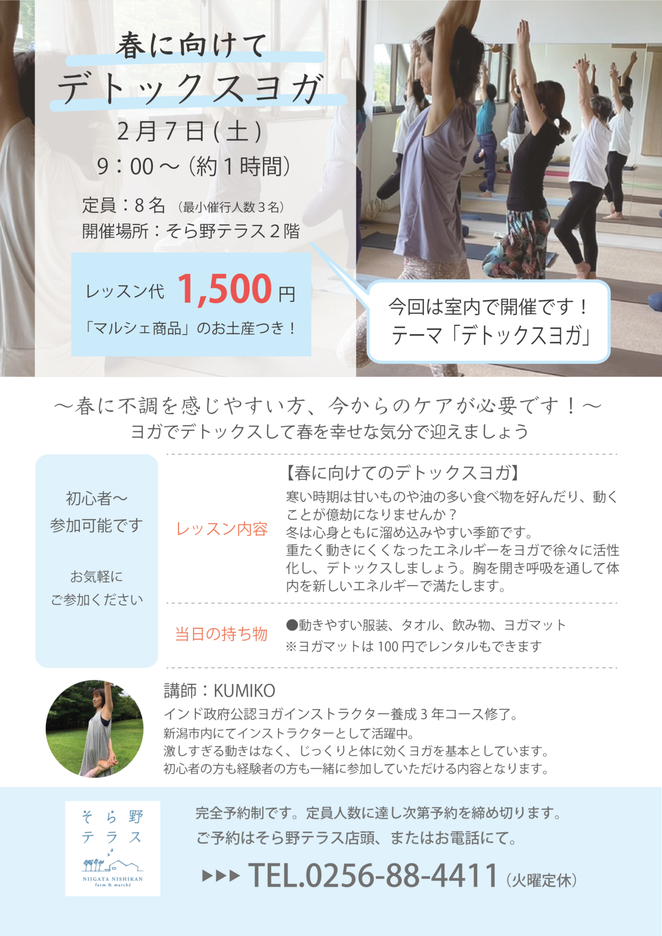 2026.01.26, イベント情報 【2月開催】ヨガ教室 2026年2月7日(土)、そら野テラス2階にてヨガ教室開催です🧘♀️ 今回のテーマは「デトックス」。 春に向けて今から体内のデトックスを始めましょう! 皆様のご予約お待ちしております☺️ « 過去の投稿