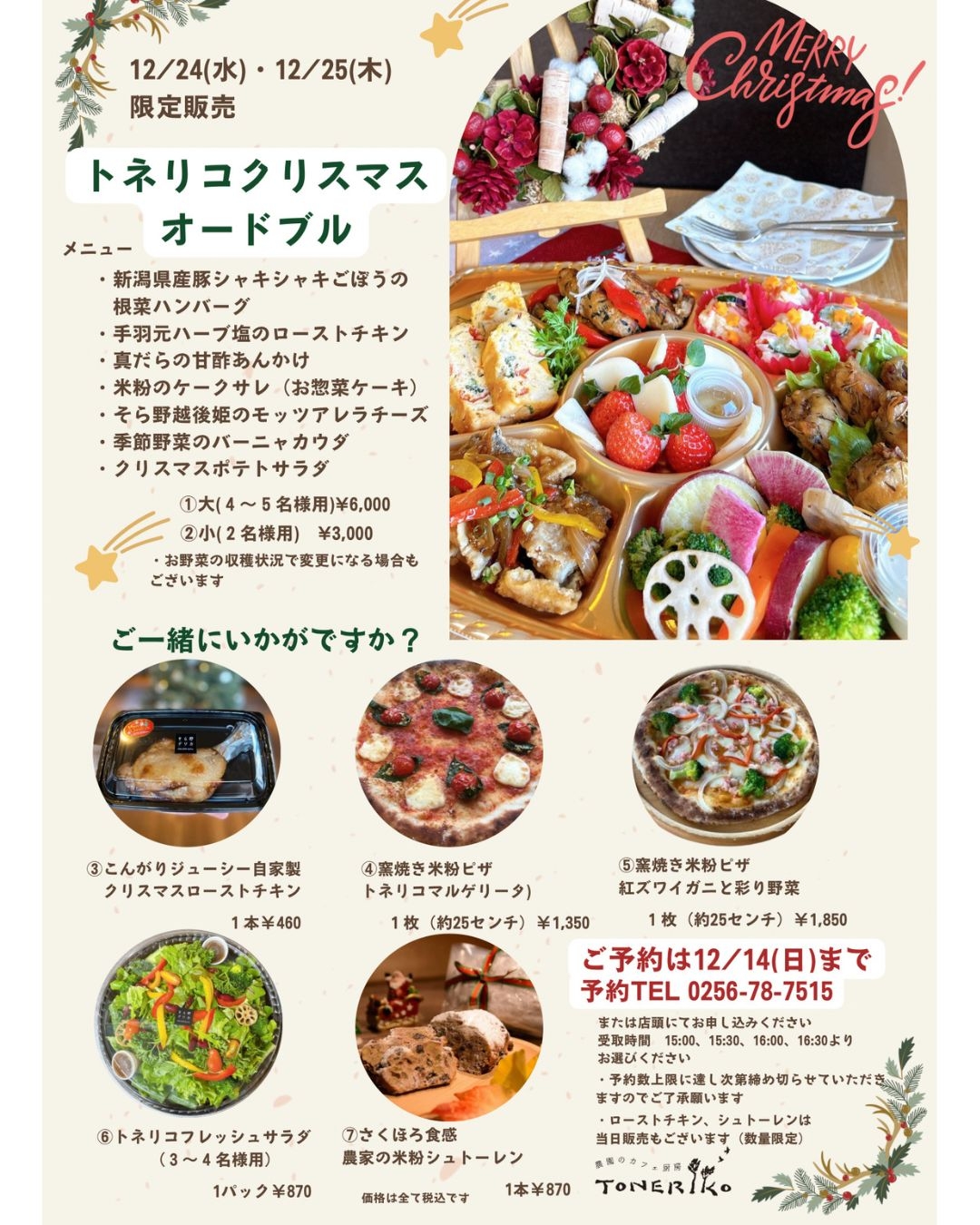 ご予約は 農園のカフェ厨房トネリコ 直通TEL 0256-78-7515 or 店頭まで